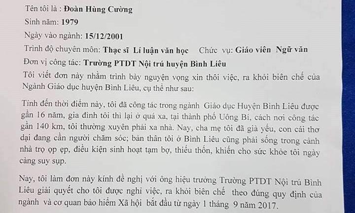 Liên quan đến việc anh Đoàn Hùng Cường viết đơn xin ra khỏi biên chế sau 16 năm giảng dạy gây xôn xao dư luận, UBND huyện Bình Liêu đã chính thức lên tiếng trước thông ti