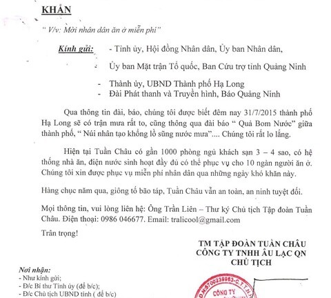 (ĐSPL) - "Chúa đảo" Tuần Châu mới đây lại ra thông báo về việc mời người dân vùng mưa lũ Quảng Ninh đến ăn, ở miễn phí tại khách sạn của mình.