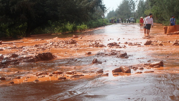 Sáng nay 18/11, một moong hồ chứa khai thác titan của công ty CP đầu tư khoáng sản và thương mại Bình Thuận (xã Thuận Quý, huyện Hàm Thuận Nam, Bình Thuận) bị vỡ, nước cuốn theo bùn đỏ tràn qua đường, khiến 3 chiếc xe máy bị cuốn trôi.