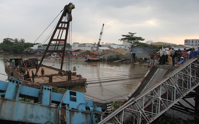 Chiều ngày 5/12, một đội công nhân của công ty Đại Toàn Thắng đã tiến hành "giải cứu" chiếc xe đầu kéo nặng 60 tấn làm gãy cây cầu tạm ở Vĩnh Long ba ngày trước đó.