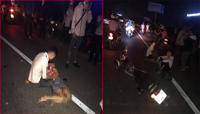 Một chiếc xe máy chở đôi nam nữ đi phía sau xe anh Nghị không tránh kịp vụ tai nạn cũng ngã xuống đường.