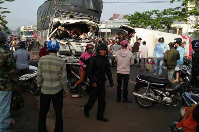 Cú va chạm khiến 1 người tử vong, 10 người khác bị thương được đưa đi bệnh viện cấp cứu. Tại hiện trường hai phương tiện hư hỏng nặng, ôtô khách lật chắn ngang đường, đồ đạc trên xe vương vãi khắp nơi.