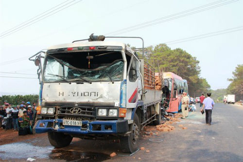 Anh vội chạy ra xem, thấy xe khách mang biển kiểm soát 51B-150.53 của nhà xe Việt Tân Phát chạy hướng từ TP.HCM về Gia Lai đến đoạn thôn Ea Plây, xã Cư Né, huyện Krông Buk, đã đâm trực diện vào đuôi xe tải chở gạch biển kiểm soát 47C. 018.17 đậu cùng chiều đang dừng ở bên đường.