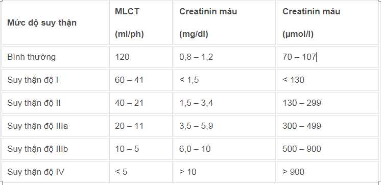 | Bảng chỉ số creatinin máu cho biết mức độ suy thận |