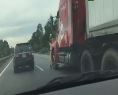Hình ảnh chiến sĩ CSGT bám vào gương chiếu hậu phía trước đầu xe container - Ảnh cắt từ clip |