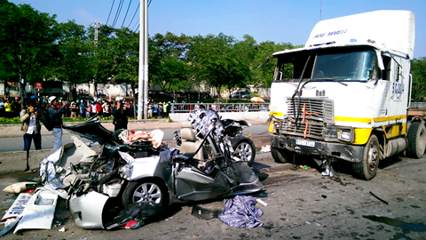 Sau khi tông vào chiếc xe 5 chỗ, xe container tiếp tục đâm vào xe chở khách 50 chỗ cùng đoàn khiến phần đuôi của xe bẹp dúm biến dạng hoàn toàn. Vụ tai nạn kinh hoàng khiến 4 người chết, 1 người tử vong tại bệnh viện. Trong số 5 nạn nhân có 3 người mang quốc tịch Mỹ.