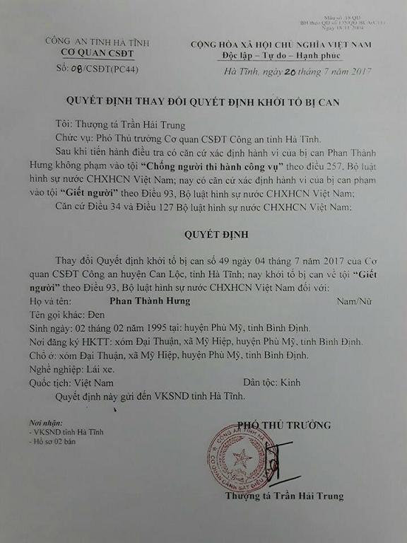 Cơ quan CSĐT Công an Hà Tĩnh quyết định thay đổi Quyết định khởi tố bị can số 49 ngày 4/7/2017 của cơ quan CSĐT Công an huyện Can Lộc, Hà Tĩnh, khởi tố bị can Phan Thành Hưng về tội “Giết người”.