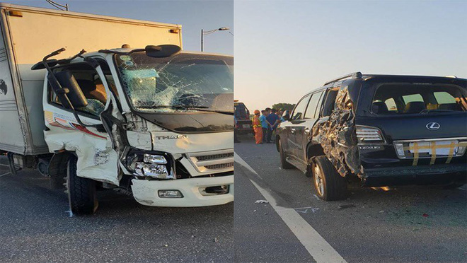 Chiếc xe tải do anh Thành điều khiển và xe Lexus hư hỏng sau vụ tai nạn. |