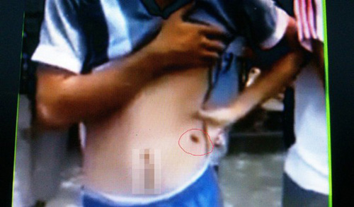 Vết đạn cao su trên mạng sườn anh Nghĩa. (Ảnh cắt từ clip/báo Người lao động). |