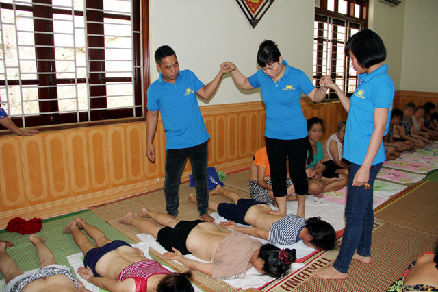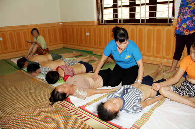 Người bệnh nằm dài để bà Phạm Thị Phú thực hiện động tác xoa bóp, đi trên lưng. |