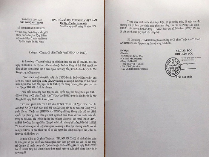 Báo Pháp luật TP.HCM đưa tin, ngày 5/11, Sở LĐ-TB&XH tỉnh Kon Tum đã có công văn tạm dừng hoạt động tư vấn, giới thiệu, tuyển dụng lao động đi làm việc có thời hạn ở nước ngoài đối với Công ty cổ phần Thuận An (Thuận An DMC), kể từ ngày 10/11/2019, trên địa bàn huyện Tu Mơ Rông (Kon Tum).