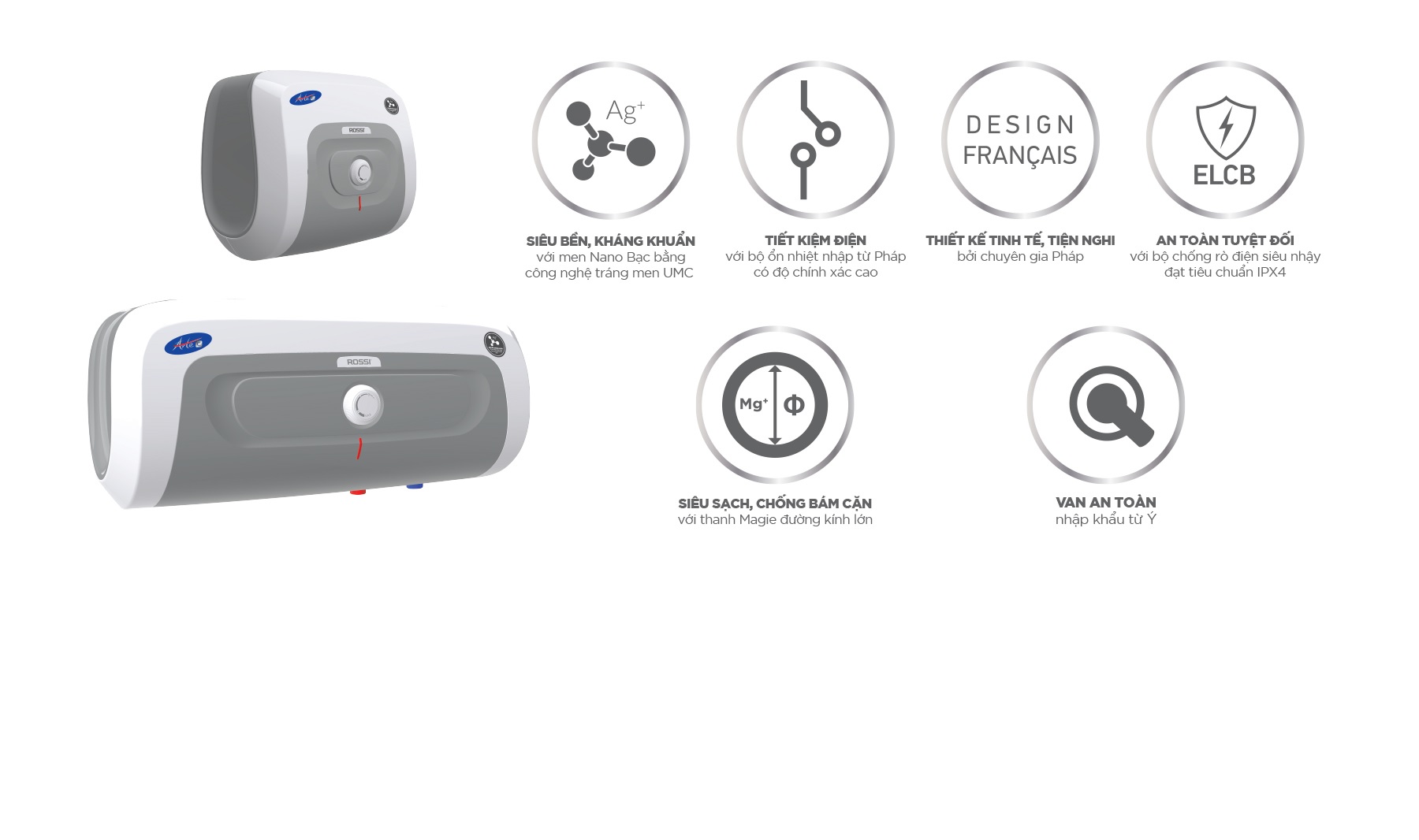 Kế thừa tính năng và kiểu dáng từ phiên bản “Nữ hoàng Bình nước nóng”, Bình nước nóng phiên bản mới Rossi Arte-C ứng dụng công nghệ 4.0, trên nền thiết kế Pháp tinh xảo, tăng thêm đẳng cấp cho ngôi nhà của khách hàng. Sản phẩm sử dụng công nghệ tráng men tiên tiến UMC với lớp men Nano Bạc giúp kháng khuẩn và kháng sự ăn mòn của nước cứng, thanh Magie đường kính lớn chống bám cặn và bảo đảm hiệu suất hoạt động luôn ổn định. Hệ thống chống rò điện ELCB siêu nhạy giúp an toàn tuyệt đối cho người sử dụng. Đặc biệt, với công nghệ tiên tiến, sản phẩm giúp tiết kiệm điện lên tới 15% so với bình nước nóng thông thường.