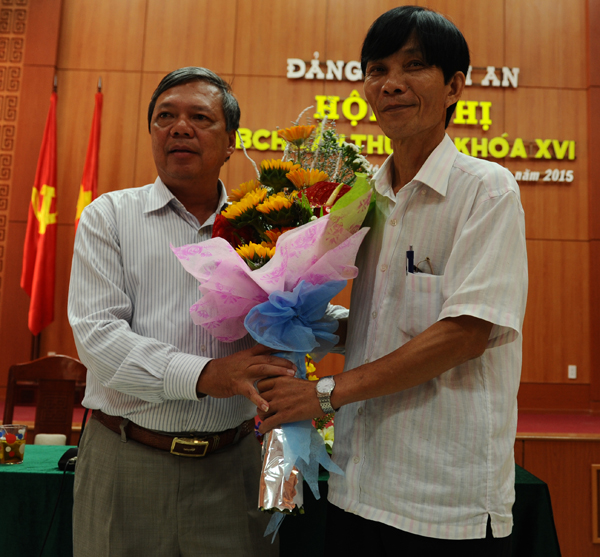 Ông Nguyễn Sự phải tặng hoa chúc mừng tân Bí thư thành ủy Hội An Kiều Cư. (Ảnh Minh Hải/báo Quảng Nam). |