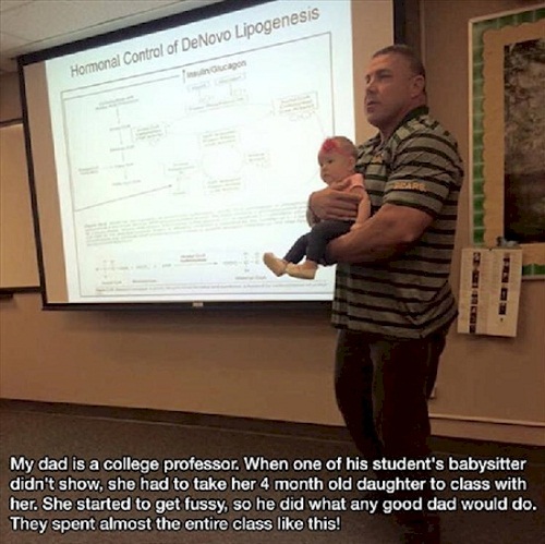 Vị giáo sư này đã giúp đỡ học viên của mình bằng cách chủ động bế và dỗ đứa trẻ khi nó bắt đầu la khóc trong lớp. “Bố của tôi là một giáo sư đại học. Một ngày người trông trẻ của một sinh viên trong lớp ông không đến trông đứa bé và cô đã phải mang đứa con gái bốn tháng tuổi đến lớp. Khi em bé bắt đầu quấy khóc, ông đã dỗ dành cô bé như một người cha, và bế cô bé như thế này trong suốt buổi học.” |