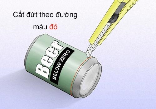 Bước 2: Bạn lấy bút vẽ một đường vòng quanh đáy lon rồi dùng dao rọc giấy cắt theo đường đã vẽ. Phần trên lon bạn cũng cắt tương tự nhưng chừa lại gần phần lỗ một đoạn ngắn khoảng 2-3cm.