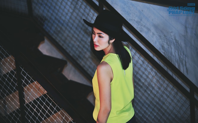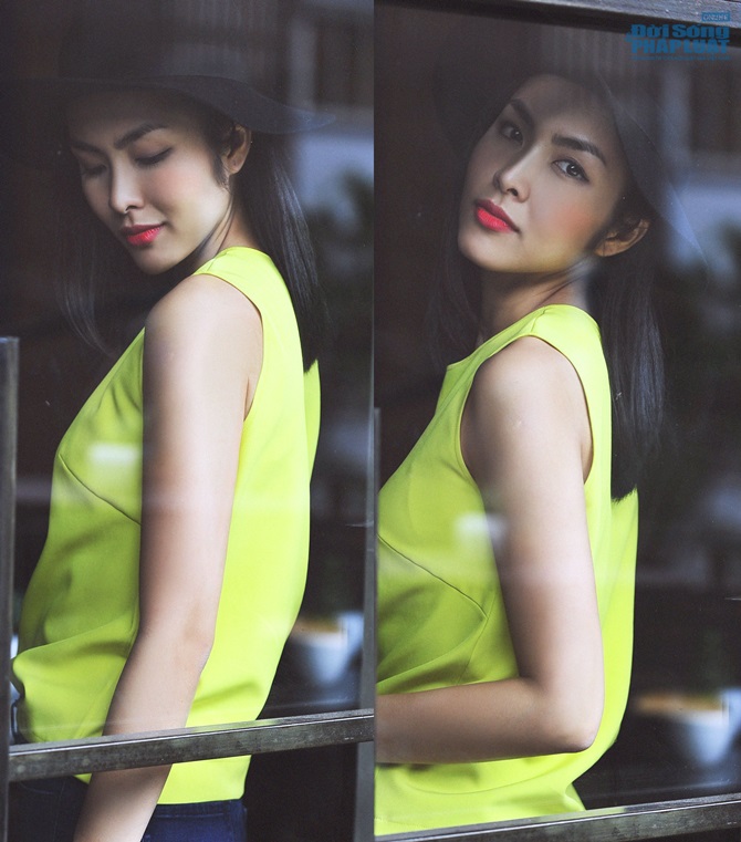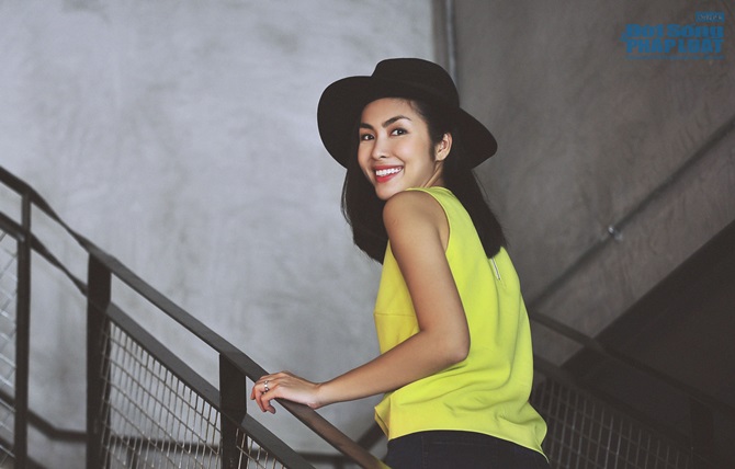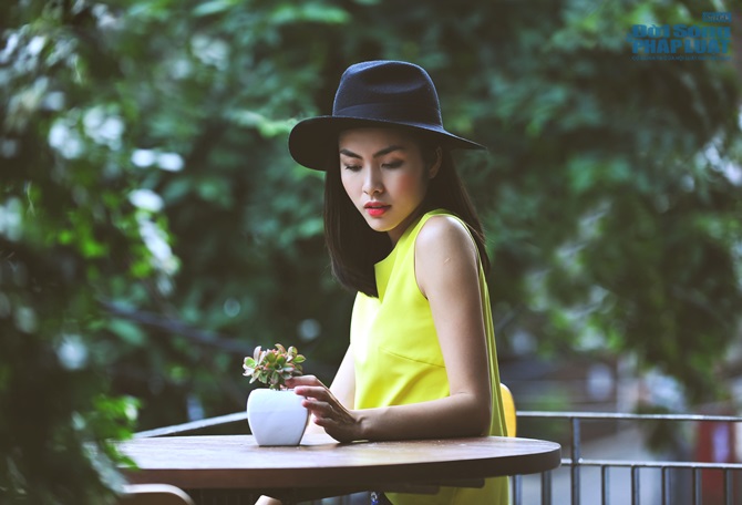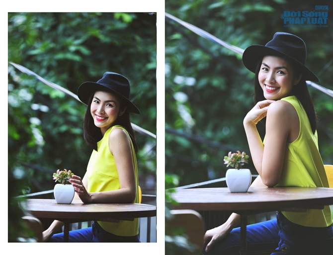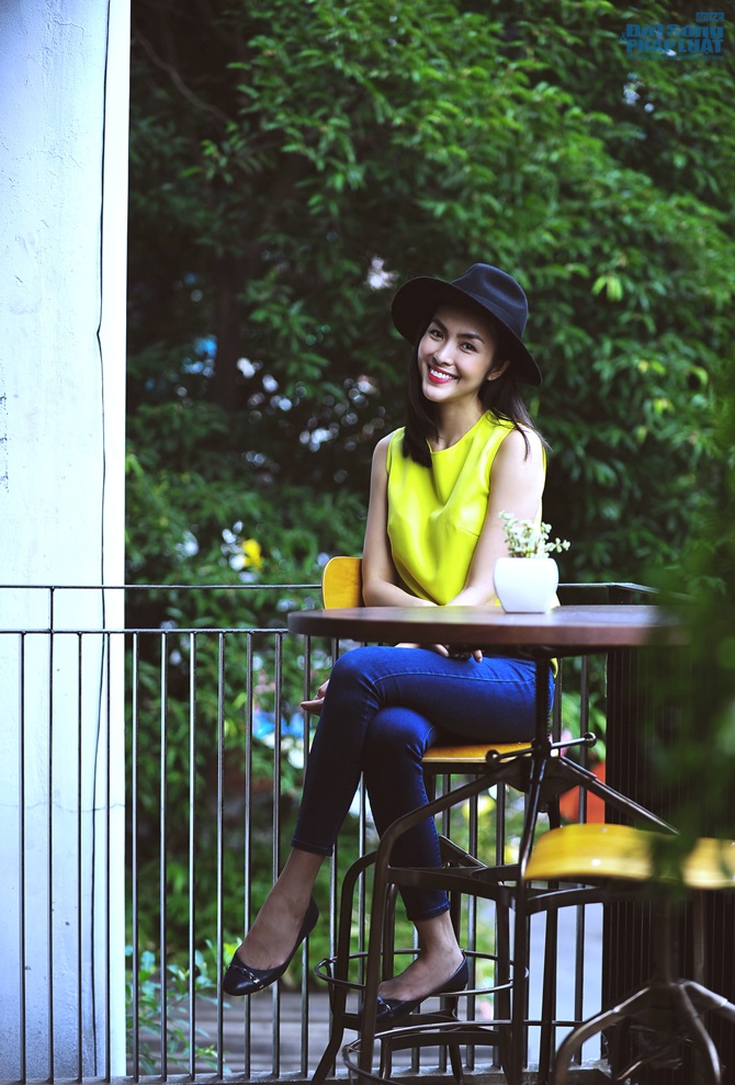 Người đẹp diện áo màu vàng chanh cùng quần jeans, mũ fedora giản dị, toát lên vẻ thanh lịch. Tăng Thanh Hà mặc giản dị nhưng bắt mắt. |