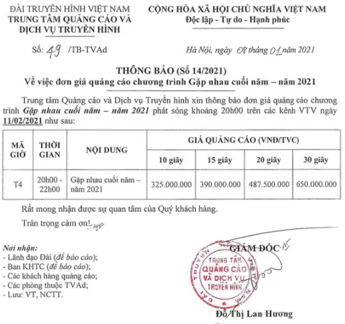 Theo đó, đơn giá quảng cáo chương trình "Gặp nhau cuối năm 2021" phát sóng vào khoảng 20h trên các kênh VTV ngày 11/2 (tức 30 Tết) là 325 triệu đồng/10 giây, 390 triệu đồng/15 giây, 487,5 triệu đồng/20 giây và 650 triệu đồng/30 giây.