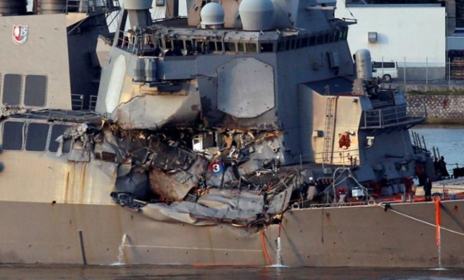 | Tàu chiến Mỹ bị đâm móp khiến 7 thủy thủ thiệt mạng. Ảnh: Reuters. |