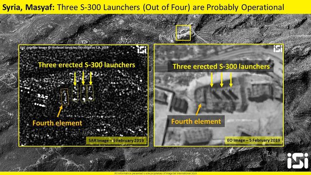 Dựa trên những hình ảnh chụp vệ tinh cho thấy, 3 trong 4 bệ phóng tên lửa S-300 của Syria dường như đã sẵn sàng trực chiến, trong khi chiếc còn lại vẫn đang hoàn tất gần thành phố Masyaf, tỉnh Hama, miền tây Syria. ISI đánh giá, bệ phóng thứ 4 này dường như chưa được đưa và hoạt động và nhiều khả năng chỉ đóng vai trò là "hàng giả", hoặc làm "mồi bẫy".