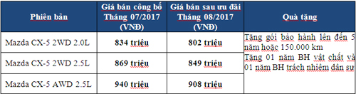 Nhân dịp Mazda CX-5 liên tục dẫn đầu phân khúc CUV tại Việt Nam (22 tháng dẫn đầu kể từ khi THACO giới thiệu phiên bản CKD năm 2015), THACO ưu đãi đặc biệt cho khách hàng với giá trị cao nhất 32 triệu đồng và tặng kèm gói bảo hiểm bảo hành mở rộng 2 năm, nâng tổng số thời gian bảo hành lên đến 5 năm hoặc 150.000 km. Đây là thời điểm lý tưởng cho khách hàng đang mong muốn sở hữu Mazda CX-5. Chương trình bắt đầu từ ngày 09/08 đến hết ngày 31/08/2017.