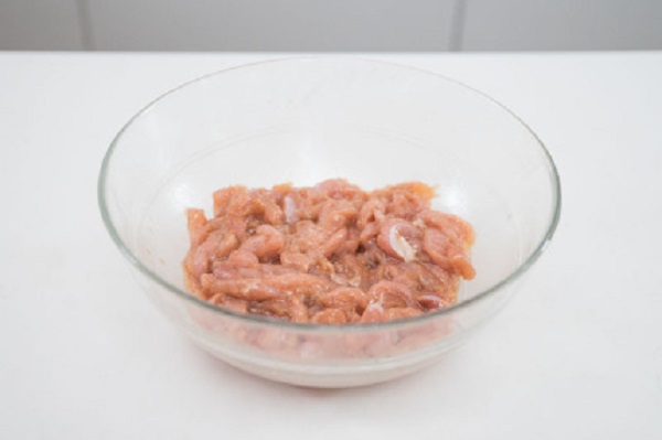 - Bước 2: Thịt rửa sạch, thái thành lát vừa ăn sau đó thêm nước tương, rượu, nước, bột năng, dầu mè, trộn đều rồi ướp khoảng 15 phút.