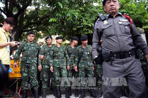 | Cảnh sát Thái Lan gác bên ngoài khu chung cư nơi nghi can vụ đánh bom đền Erawan bị bắt giữ. Ảnh: AFP/TTXVN |