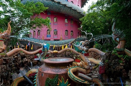 Đền Wat Samphran là công trình tôn giáo lạ nhất trên đất nước Thái Lan. Với hình ảnh con rồng khổng lồ uốn bao quanh ngôi đền vừa thể hiện quyền uy vừa thể hiện sự bảo vệ điều linh thiêng của ngôi đền. Khuôn viên của đền được trang trí bằng rất nhiều tượng điêu khắc hình rồng. Du khách sẽ bị ấn tượng bởi dọc các lối đi cũng có khá nhiều tượng đầu rồng.