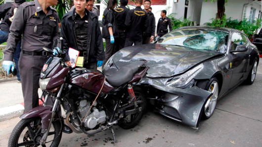 Vụ tai nạn diễn ra vào rạng sáng 3/9/2012. Lúc này, chiếc siêu xe Ferrari màu xám gầm rú trên đường Sukhumvit, Bangkok, đâm vào thượng sĩ Wichian Klanprasert đang lái môtô, khiến viên cảnh sát ngã xuống đất và kéo lê một đoạn trước khi bỏ chạy.