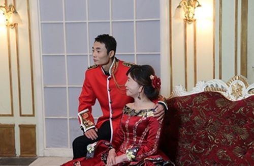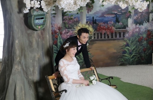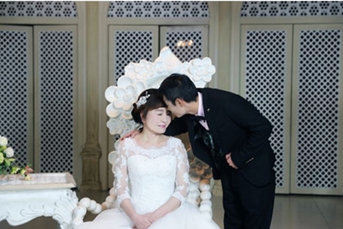 Cô dâu xuất hiện trong chiếc váy cưới với gương mặt nhăn nheo, già nua, còn chú rể lại trẻ trung hơn nhiều.
