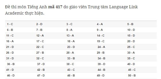 Tham khảo đáp án môn tiếng Anh mã đề 417 THPT quốc gia 2019