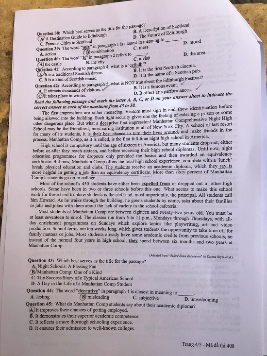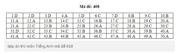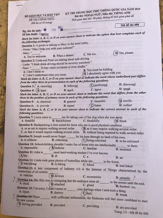 Đáp án tham khảo môn tiếng Anh mã đề 408 THPT quốc gia 2019. Cập nhật đáp án gợi ý môn tiếng Anh mã đề 408 THPT quốc gia 2019 nhanh nhất trên trang Đời sống & Pháp luật.