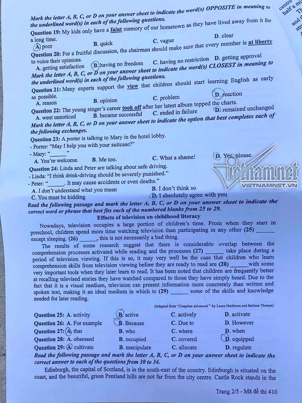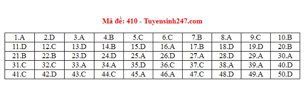 Đáp án gợi ý môn tiếng Anh mã đề 410 THPT quốc gia 2019 |