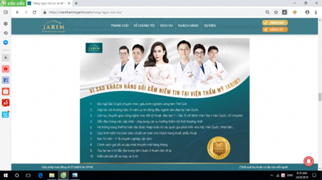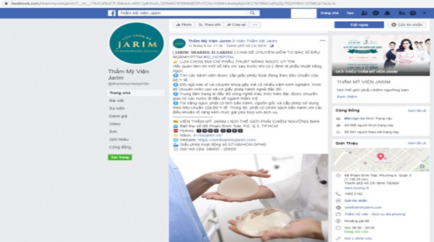 Đơn cử như trường hợp của Viện thẩm mỹ Jarim (địa chỉ số 6B Phạm Đình Toái, phường 6 - quận 3 - TP Hồ Chí Minh). Cụ thể theo ghi nhận của PV (thời điểm tháng 9/2019) trên trang web https://vienthammyjarim.com, và trang facebook: https://www.facebook.com/thammyvienjarim/?__tn__=,d,P-R&eid=ARC1jdHhvm_QPMAO3FXR4t6E3Pc1C2m1t3Mmdw8qXym9CCN1fBbCuEfcjZjcTfQHYfKV-ZOWQs7aUu-b và kênh chia sẻ hình ảnh trên Youtobe Jarim Beauty Center & Spa