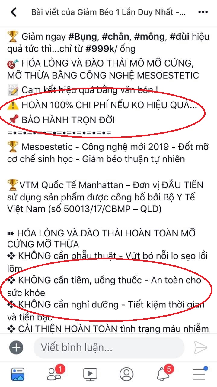 Phía cơ sở thẩm mỹ quảng cáo rằng có hợp đồng cam kết về hiệu quả sau 3 ngày trị liệu, quy trình thực hiện việc giảm béo cũng như thẻ bảo hành không giới hạn thời gian nên chị N. đã tin tưởng và tốn một số tiền không nhỏ để thực hiện dịch vụ tại đây.