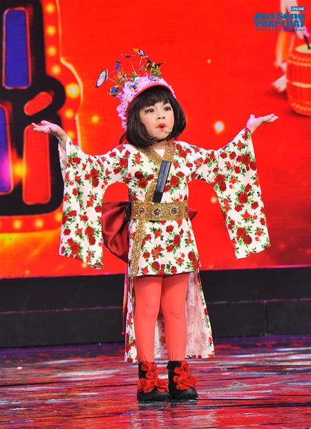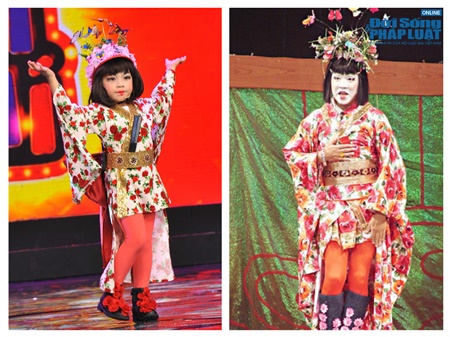 An Khang với phong cách Geisha khi hóa thân thành NSƯT Thành Lộc trong tiết mục “Nữ thần nhảy múa” ở tập 4 Thử Tài Siêu Nhí. |
