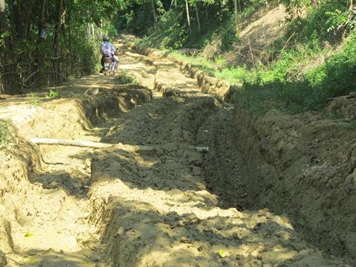 Chúng tôi đến thăm thôn Tân Biên và thôn Tân Cương, xã Tân Phúc, huyện Lang Chánh phải men theo con đường ghồ ghề, lởm chởm những ụ đất ngay từ trung tâm xã. Dọc suốt con đường này là đường đất với những đoạn hằn xe sâu đến cả mét, đầy ổ voi, ổ gà khiến người đi đứng tim, dựng tóc gáy, buộc phải dừng dắt bộ.