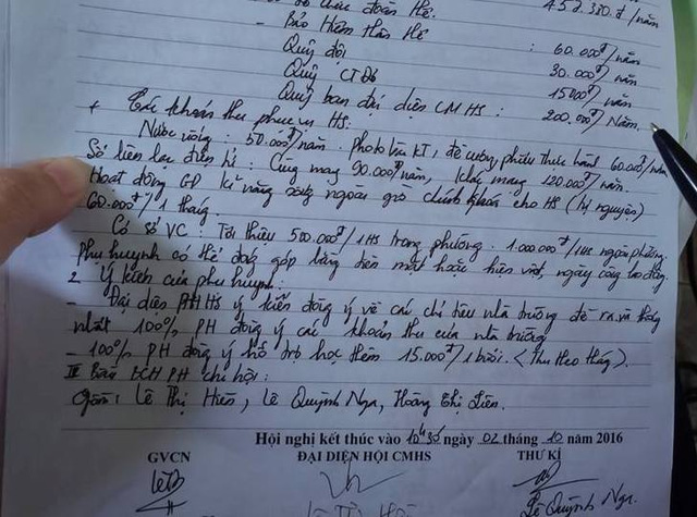 Điều đáng nói, tại trường này, phụ huynh cho biết họ phải đóng tiền hỗ trợ khuyến học: 200.000đ, mua vở ô ly: 10 cuốn: 65000đ, vở học hai buổi (6 cuốn): 97.000đ, sách tiếng Anh: 120.000đ, đồng phục (quần hoặc váy: 85.000đ, áo dài tay: 85.000đ, áo cọc tay: 80.000đ, áo rét: 105.000đ). Đây là những khoản không được UBND TP cho phép thu, khoản thu học kỹ năng sống: 50.000đ/tháng phải được sự đồng ý của phụ huynh có đơn tự nguyện cho con học mới được thu tiền, xã hội hóa đưa mức 500.000đ/HS.