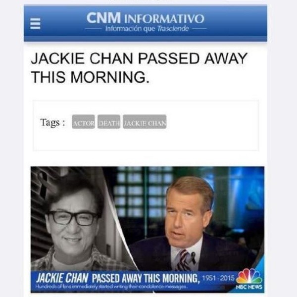 Thông tin này được đăng tải rộng rãi với dòng tiêu đề: “Thành Long qua đời vào sáng nay”. Theo đó, CNM trích thông tin từ NBC News cho hay, ngày 15/5, nam diễn viên gạo cội từ trần tại bệnh viện sau cơn đau tim đột ngột. Vợ Thành Long - Lâm Phụng Kiều xác nhận thông tin về sự ra đi của chồng.