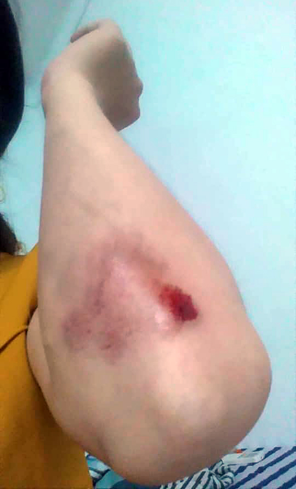 Chị Mai Phương đang mang bầu 8 tháng bị xô ngã làm thâm tím cả tay, chân. |