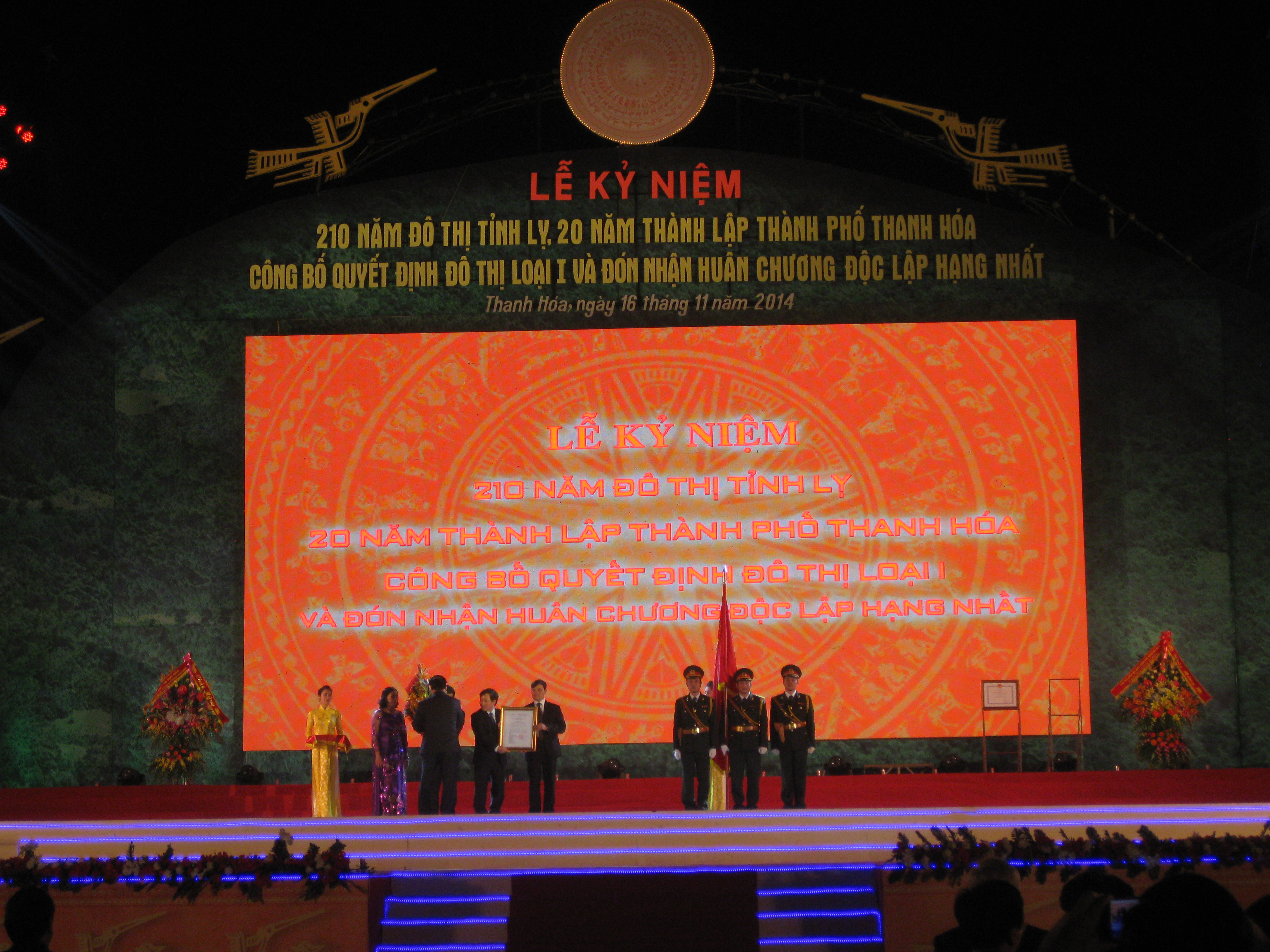 (ĐSPL) - Tối 16/11, tại quảng trường Lam Sơn, Thành ủy, HĐND, UBND, UBMTTQ TP Thanh Hóa tổ chức lễ kỷ niệm 210 năm đô thị tỉnh lỵ (1804 - 2014), 20 năm thành lập thành phố (1994 - 2014), công bố quyết định công nhận TP Thanh Hóa là đô thị loại I trực thuộc tỉnh và đón nhận Huân chương Độc lập hạng Nhất.