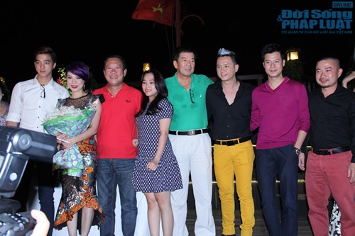 | Thanh Thảo thân mật bên Quang Dũng và các bạn bè, đồng nghiệp. |