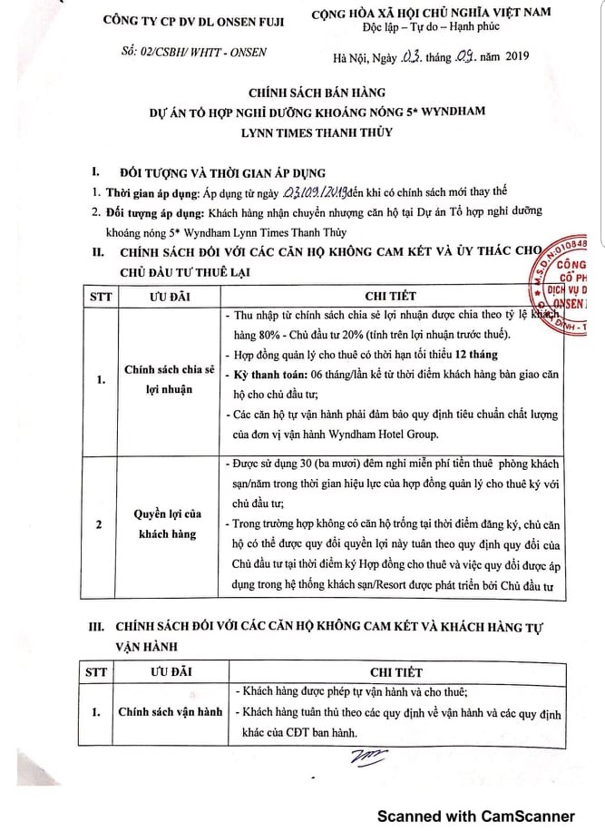 “Anh yên tâm, thủ tục pháp lý của dự án rất rõ ràng, chủ đầu tư cam kết trong vòng 5 năm đầu lãi suất sẽ là 12%/năm. Từ 5 năm trở ra thì lợi nhuận sẽ được chia 80/20 cho chủ đầu tư. đây là sản phẩm nghỉ dưỡng mới ra và giành được sự quan tâm cực kỳ lớn của khách hàng ở Thủ đô. Bởi vì đây là sản phẩm nghỉ dưỡng ven đô, khách hàng có thể mua để cuối tuần hay những dịp rảnh rỗi về nghỉ ngơi. Ngoài ra, trong thời gian không nghỉ có thể ủy thác cho chủ đầu tư quản lý, vận hành và kinh doanh, khách hàng vẫn thu được lợi nhuận”, nhân viên này tư vấn nhiệt tình.