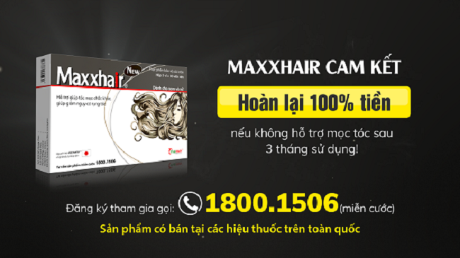 Theo đó, sau 3 tháng dùng TPBVSK Maxxhair với liều 4 viên/ ngày, quý khách vui lòng chụp ảnh lại phần da đầu bị rụng tóc để đánh giá hiệu quả trước và sau khi dùng. Nếu sản phẩm không hề có tác dụng mọc lại tóc con, quý khách sẽ được hoàn lại toàn bộ số tiền đã sử dụng trong thời gian 3 tháng với giá là 200.000 đồng/hộp. Để đăng ký tham gia quý vị vui lòng gọi tới hotline miễn cước 18001506. Chi tiết chương trình XEM TẠI ĐÂY!