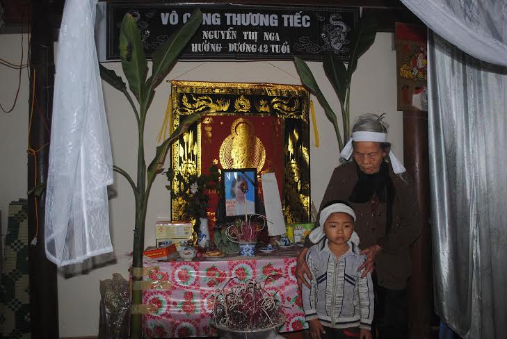 | Bà Ngọc và cháu Minh bên bàn thờ chị Nga đang nghi ngút khói hương. |