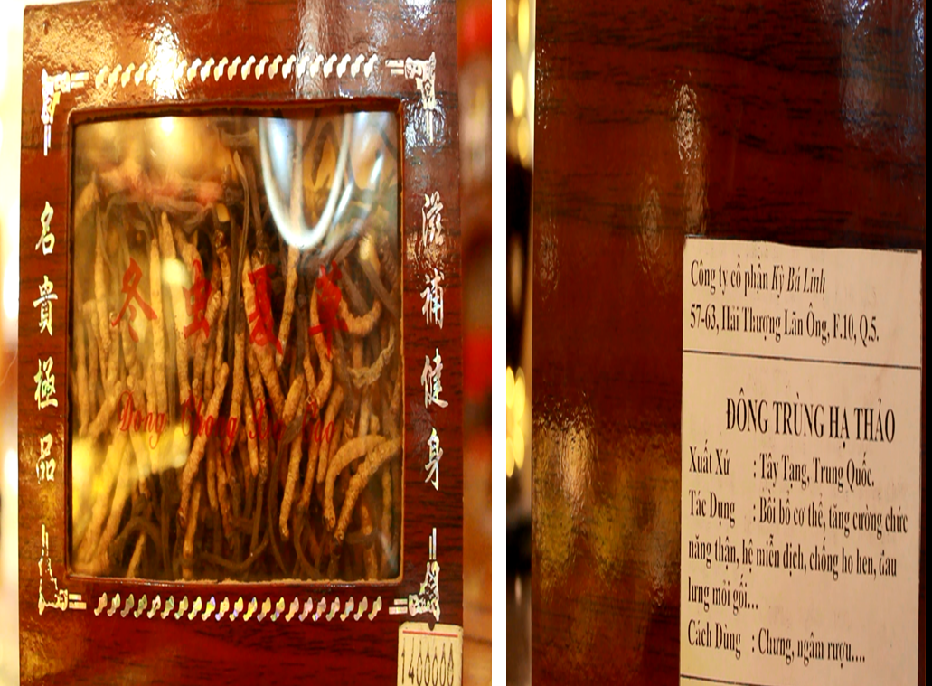Cửa hàng này có hai loại đông trùng hạ thảo. Loại thứ nhất là khai thác từ tự nhiên với giá 70 triệu/100g (chêch lệch với cửa hàng Yến Nhung 10 triệu đồng). Loại thứ 2 sản xuất nhân tạo với giá 3 triệu/100g. Loại được đựng trong túi nilon là loại hai, không nhãn mác, không xuất xứ gần 60g với giá 1,8 triệu đồng