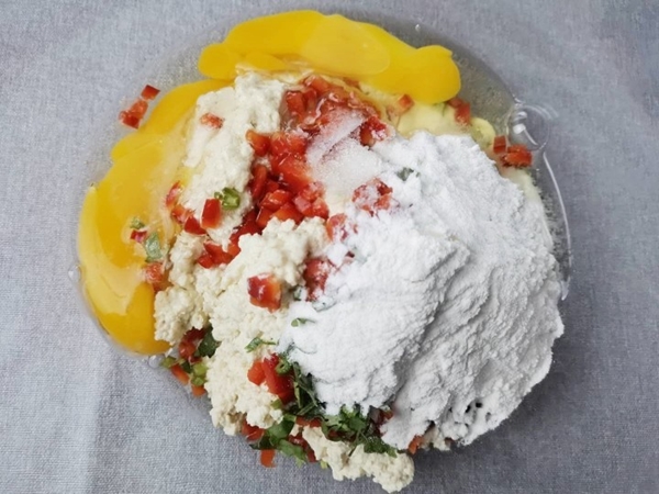 Rau mùi thái nhỏ, ớt xuống thái nhỏ rồi đổ vào bát đậu. Thêm muối, hạt tiêu vừa miệng vào. Thêm lượng bột mì thích hợp và đập 2 quả trứng vào. Trộn đều tất cả cho các nguyên liệu quyện vào nhau.