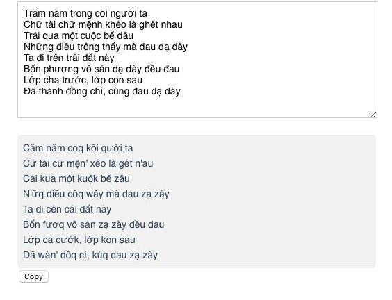 Các âm vị trong bảng chữ cái sẽ được chuyển đổi theo quy tắc : C = Ch, Tr; D = Đ; G = G, Gh; F = Ph; K = C, Q, K; Q = Ng, Ngh; R = R; S = S; X = Kh; W =Th; Z = d, gi, r. Vì âm “nhờ” (nh) chưa có kí tự mới thay thế, nên trong văn bản trên tạm thời dùng kí tự ghép n’ để biểu đạt.