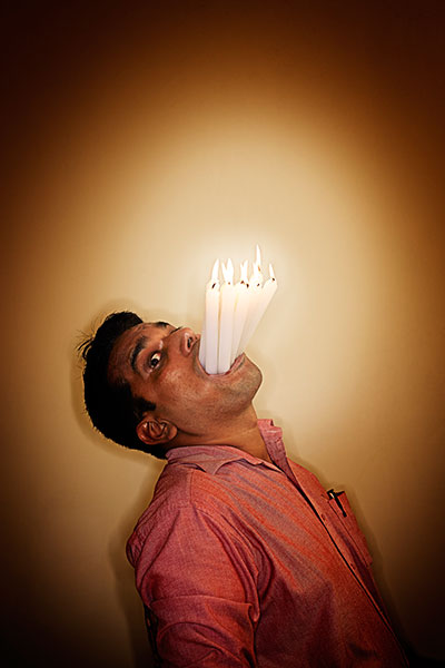 Thầy giáo người Ấn Độ ngậm 12 cây nến trong miệng. |