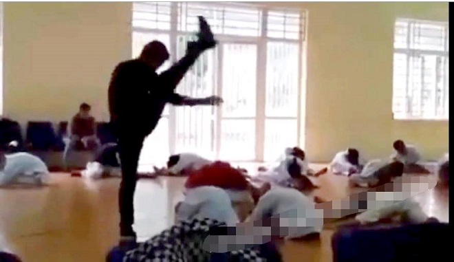 Trong clip, khoảng 20 học viên cố gắng cúi đầu xuống sát đất trong bài tập ép cơ, một người đàn ông mặc bộ đồ tối màu, đi giày thể thao liên tục tung những cú đá, đấm vào lưng, gáy, ngực nhiều học sinh. Người này còn chỉ tay vào mặt học sinh lúc nói chuyện.