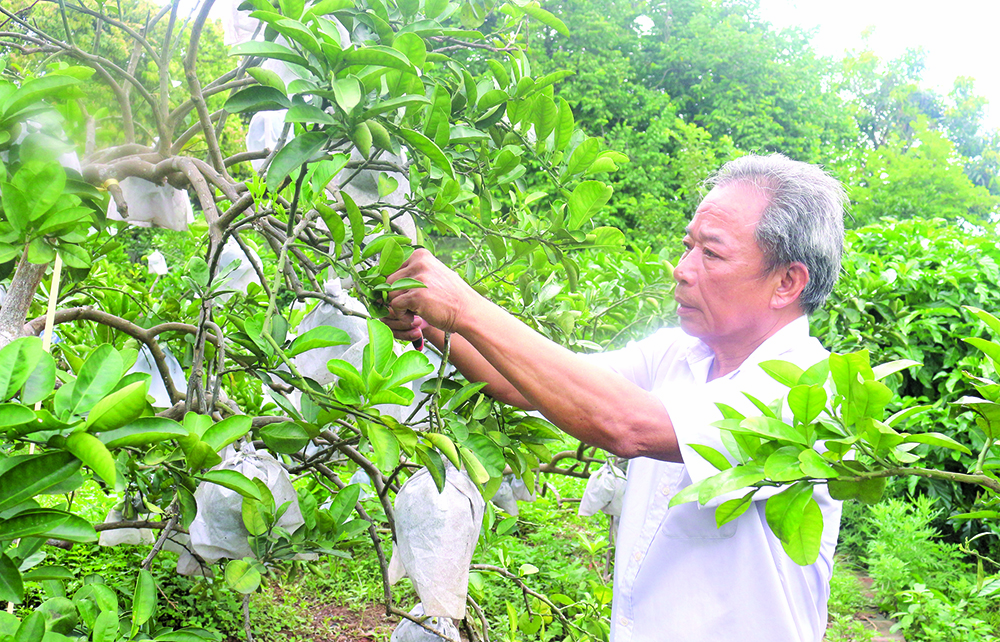 Thầy Phan Ngọc Trâm chăm sóc vườn bưởi Diễn mang lại giá trị kinh tế cao của mình - Ảnh: Báo Phu Thọ. |